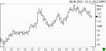 Также над рынками все еще довлеет проблема европейского долга. Греческий парламент вчера вечером одобрил очередное сокращение государственных расходов и повышение налогов, но этот фактор не смог помешать падению курса евро как против доллара, так и против иены и британского фунта. Европейская Комиссия опубликовала доклад, согласно которому ВВП еврозоны вырастет всего на 0.1% в 2013 году, а результаты года текущего окажутся хуже прошлых прогнозов. Пара EURJPY упала сегодня утром до самого низкого с середины октября значения – 101.74 (см. график ниже). Курс единой валюты против доллара и вовсе упал вчера до двухмесячного минимума – 1.2735.